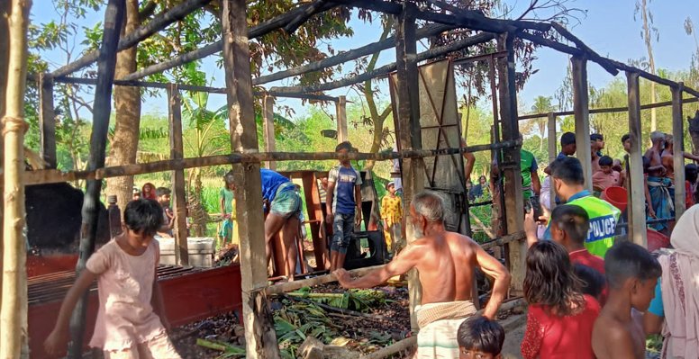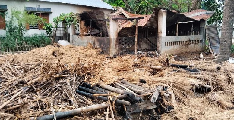 রোববার বিকেলে সরেজমিন গিয়ে দেখা গেছে, গোয়ালঘর পুড়ে গেছে। পুড়ে যাওয়া একটা গরু বাঁধা রয়েছে। বাড়ির কয়েকটা স্থানে আগুনের চিহ্ন। উৎসুক জনতা ভিড় করেছে।