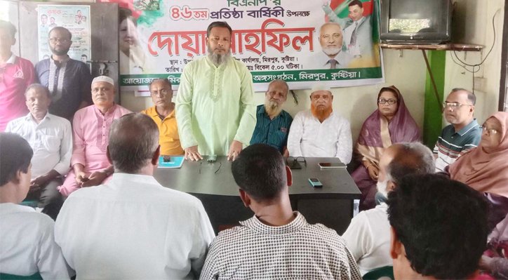 বিশেষ প্রতিনিধি ॥ বিএনপির চেয়ারপার্সন বেগম খালেদা জিয়ার আশু রোগমুক্তি ও সুস্থতা কামনায় কুষ্টিয়া সদরের ঝাউদিয়া ইউনিয়ন বিএনপির আয়োজনে দোয়া মাহফিল অনুষ্ঠিত হয়েছে। গতকাল বুধবার (৩ ডিসেম্বর) দুপুর ৩টার দিকে কুষ্টিয়া সদর উপজেলার হাতিয়া বাজারে এ দোয়া মাহফিলের আয়োজন করা হয়। অনুষ্ঠানে প্রধান অতিথি ছিলেন, জেলা বিএনপি আহবায়ক কুতুব উদ্দিন আহমেদ। প্রধান বক্তা ছিলেন কুষ্টিয়া-৩ সদর আসনে বিএনপির মনোনীত সংসদ সদস্য প্রার্থী প্রকৌশলী জাকির হোসেন সরকার। বিশেষ অতিথি ছিলেন, পৌর বিএনপির সাধারণ সম্পাদক কামাল উদ্দিন, জেলা যুবদলের সাবেক সিনিয়র সহ সভাপতি মেজবাউর রহমান পিন্টু, সদর উপজেলা বিএনপির সাবেক সিনিয়র সদস্য অধ্যাপক মাহাবুব আলম বিশু ও বর্তমান কমিটির সাংগঠনিক সম্পাদক জিহাদুজ্জামান জিকু, সদর উপজেলা যুবদলের আহবায়ক আব্দুল মাজেদ প্রমূখ।
